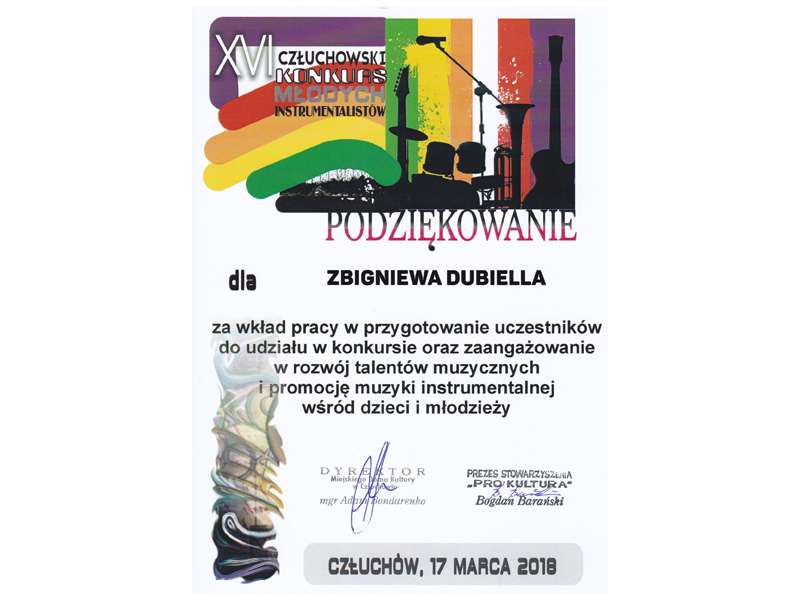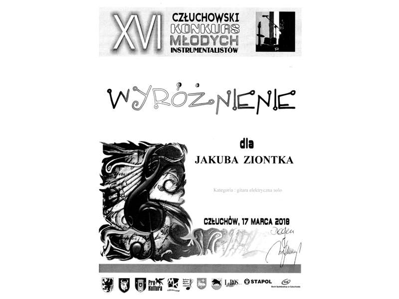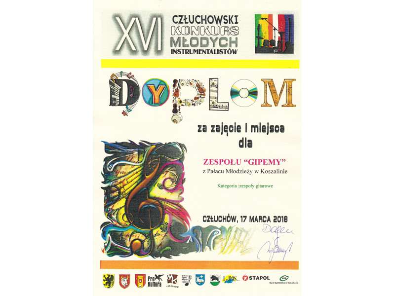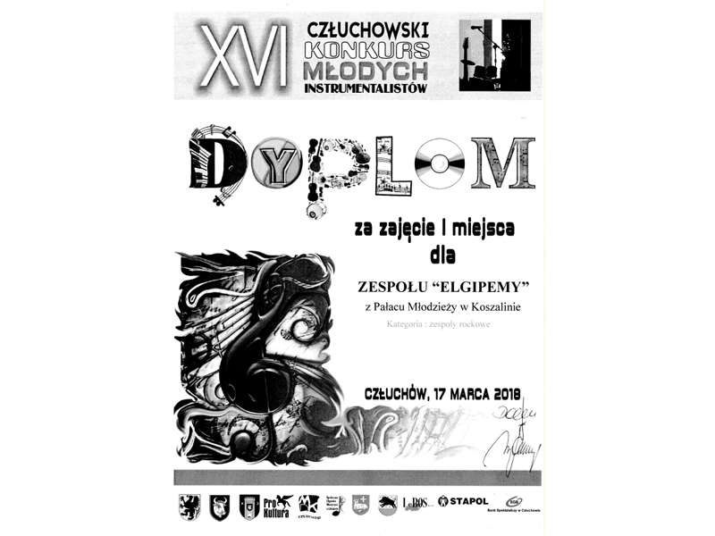 17 marca 2018 roku odbył się w MDK w Człuchowie już XVI Człuchowski Konkurs Młodych Instrumentalistów na który przyjechało prawie stu uczestników reprezentujących różne formy wykonawcze i różne instrumenty m.in  ze Szczecina, Bydgoszczy, Koszalina. Najliczniej reprezentowane były gitary.  W gronie akustycznych zespołów I miejsce zdobył Kwintet Gitarowy PM w Koszalinie GIPEMY w składzie: David Heddergott, Jakub Ziontek, Aniela Dąbrowska, Wiktoria Studzińska i Filip Podgórski. Wśród zespołów rockowych najlepszy ( I miejsce ) okazał się zespół ELGIPEMY z PM w Koszalinie w składzie ; David Heddergott, Jakub Ziontek, Filip Podgórski i Wojciech Kaźmierczak. Solista  Kacper Krężołek otrzymał  III miejsce a Jakub Ziontek III miejsce.Wszyscy otrzymali nagrody finansowe i rzeczowe oraz wystąpili na wieczornym koncercie laureatów, zyskując wiele pochlebnych opinii.ZD