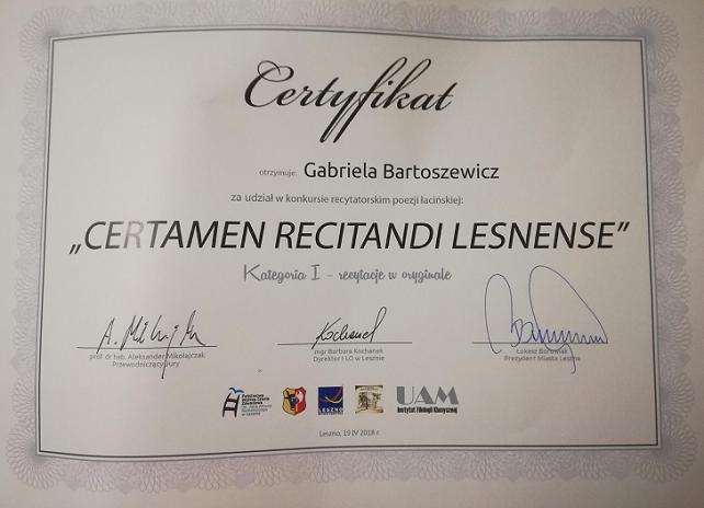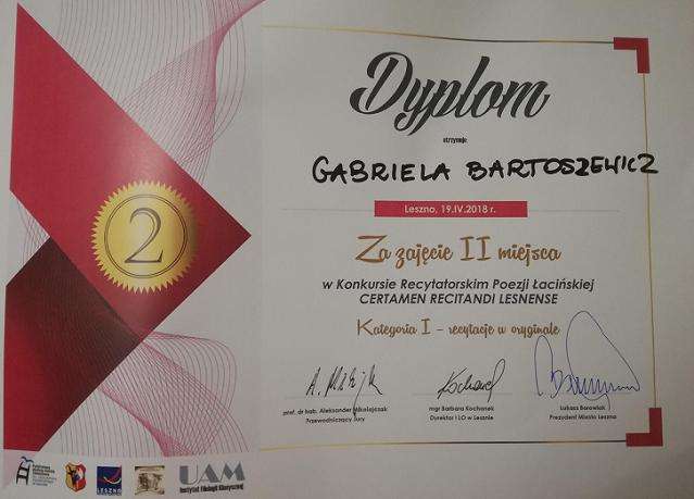 sukcesem wychowanki pałacowej sekcji języka ŁACIŃSKIEGO, Gabrieli Bartoszewicz,