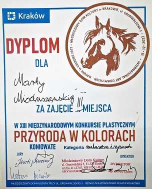 Marta Mioduszewska, wychowanka Pracowni marzeń p. Dominiki Paulińskiej- Tylec, zajęła III miejsce w Międzynarodowym Konkursie Plastycznym " Przyroda w kolorach - koniowate" . Wielkie brawa !!!